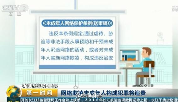 1. 央视财经:【国家动真格:网上发贴攻击威胁未成年人,或被判刑!】)国家网信办起草的《未成年人网络保护条例(送审稿)》指出,任何组织和个人不得通过网络以文字、图片、音视频等形式威胁、侮辱、攻击、伤害未成年人。送审稿中明确,对未成年人实施网络欺凌,构成犯罪的,将被依法追究刑事责任。